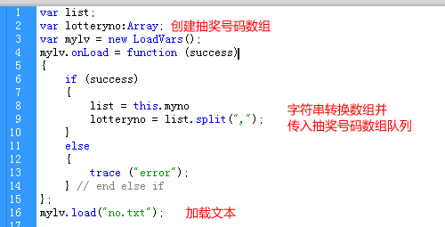 程序分析:读取文本中号码,加载入数组队列,编写事件处理方法函数,随机抽取数组队列中的号码,显示中奖号,确认中奖号,记录在中奖动态文本,从号码数组队列中移除已中奖号码