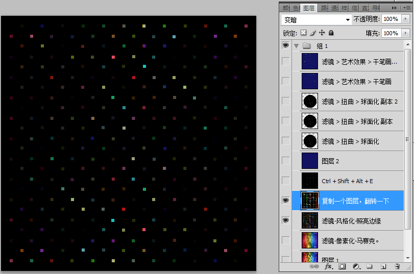 然后用选区框,画一个圆形,接下来咱们来做球面化效果。滤镜-扭曲-球面化,设置为默认。然后再复制几层添加模式,目的是让彩点更明显,越明显越好。