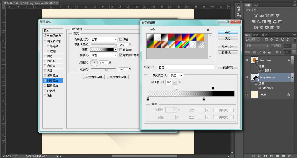 好了,现在是给它添加长投影的时间了,创建矩形,大小352x160px,其他的按照前边的长投影一样变换角度,添加渐变就大功告成了