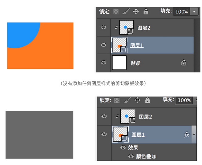 当给图层1添加颜色叠加的效果后,发现图层2被颜色叠加的效果遮挡住了。