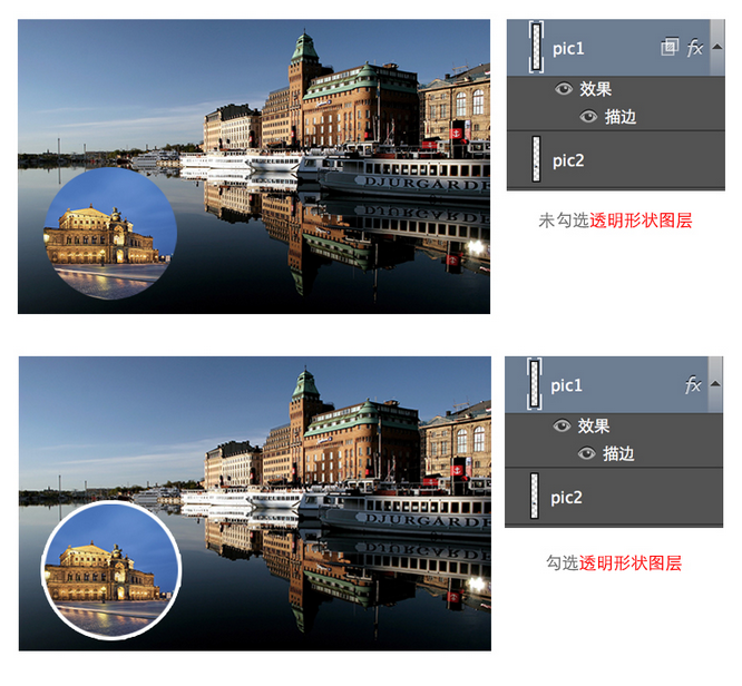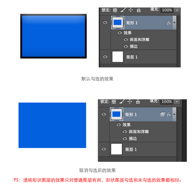 透明形状图层的作用是将图层效果限制在当前图层的不透明区域中。在默认情况下,这一选项是被选择的,如果取消了这一选项,那么图层效果将对整个透明图层而非只对当前图层的不透明度区域起作用。