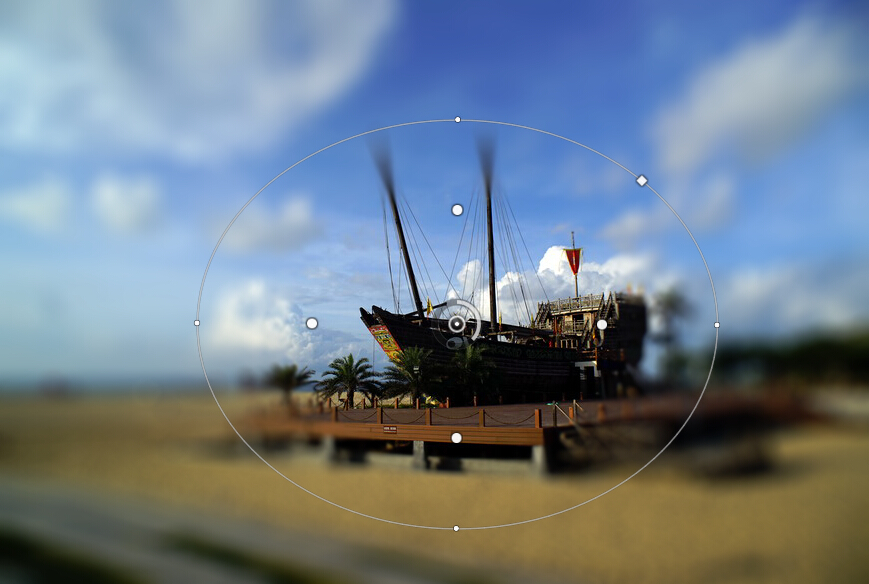 光圈模糊,会自动生成一个椭圆形的模糊范围,拖动内部的四个圆形,可以控制模糊范围的大小。椭圆线上的四个小圆点可以控制光圈的方向。