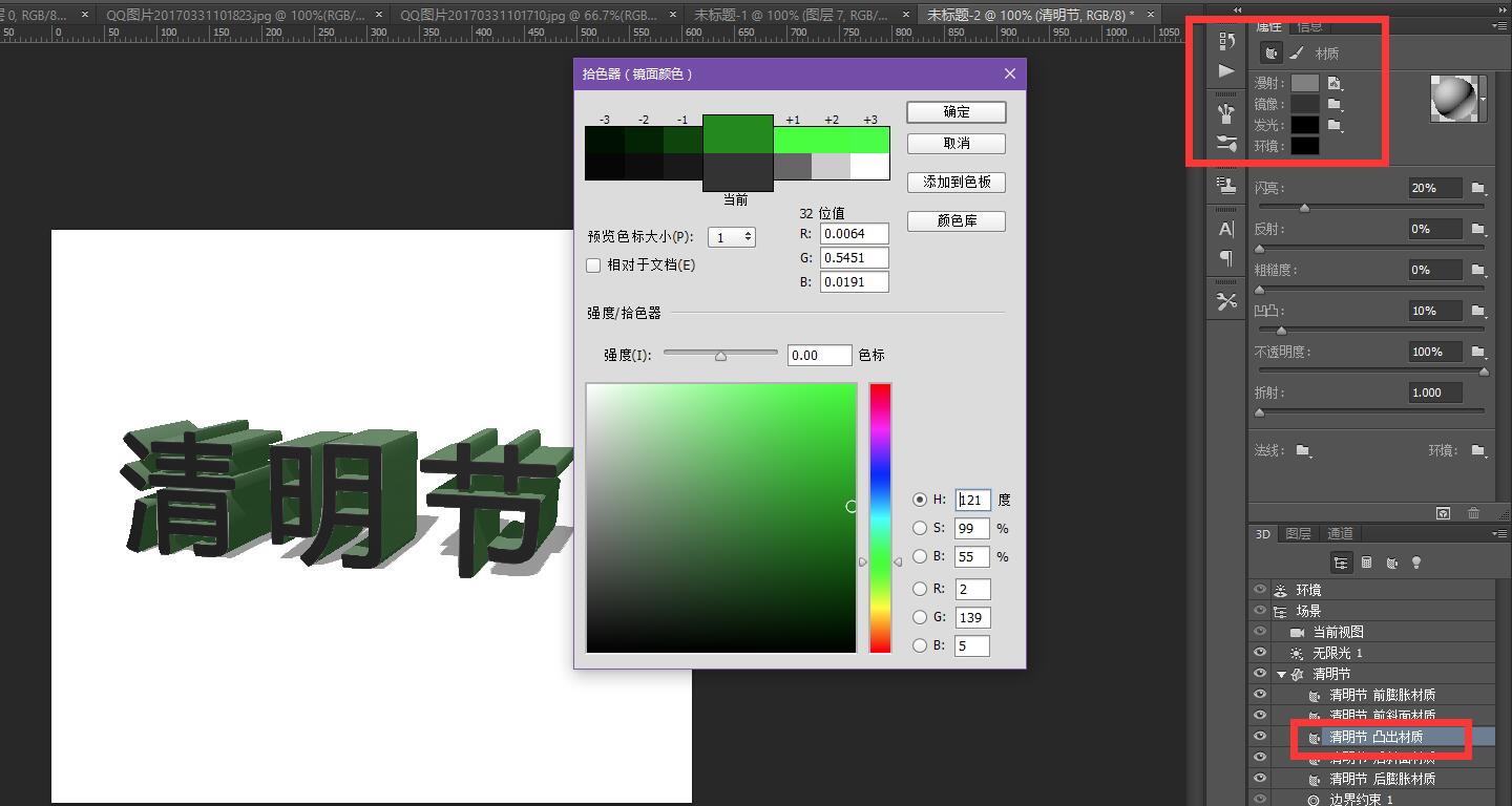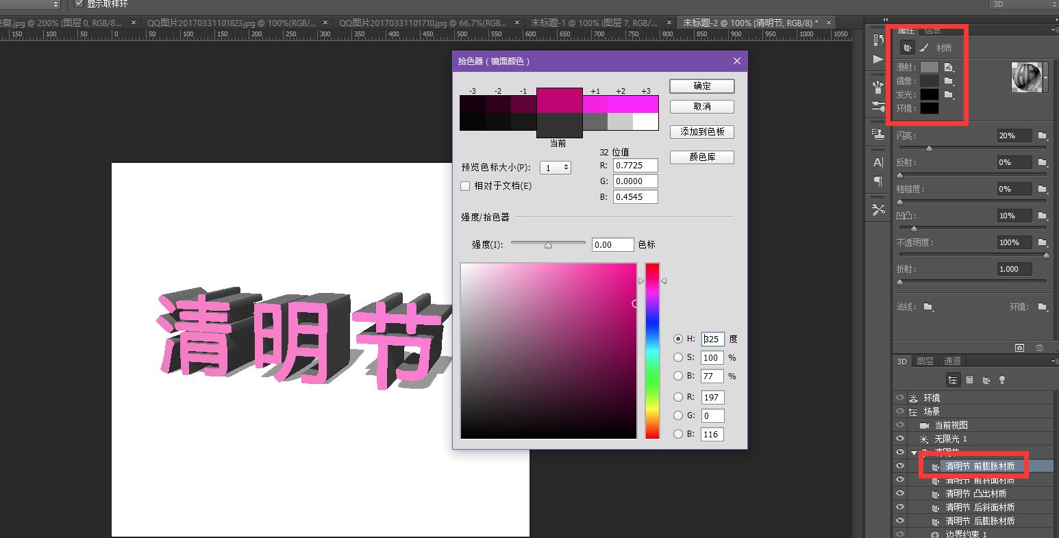 PS 3d功能制作立体字 先将文字栅格化 选择3D应用,下面右图效果 可在空白处点击鼠标变化文字的上下左右旋转位置,如下图 点击3D图层可随意变化颜色,3D光源调试等,如下图 大概的效果已成形,为方便应可将图层转换智能对象,用魔棒工具选取表面层,新建一个图层填充颜色 最后可根据需要在3D图上利用素材图做一些效果