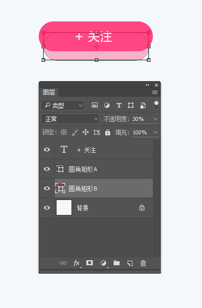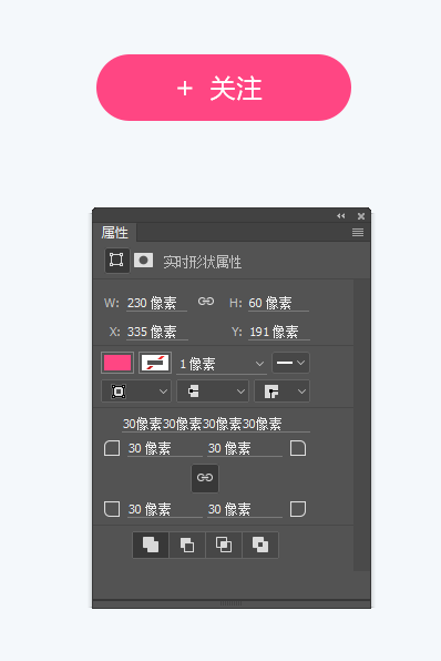 第一步、这里以界面中的圆角矩形按钮来做示范,先画个230*60的圆角矩形,色值#ff4683,得到一个圆角矩形A