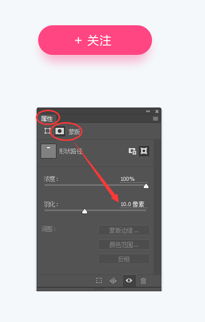 第三步、点开PS工具栏中的窗口-属性-蒙板,设置羽化为10,哒啦~一个最最简单的弥散阴影就做出来啦