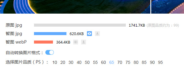 智图能够自动为您选择压缩率压缩并且在合适的情况下为您选择正确的图片格式。与此同时,智图也会为您上传的图片转换一份webP格式的图片。WebP是Google在2010年发布的一种新型图片格式,支持无损和有损压缩。在无损压缩方面,同质量的WebP图片比PNG的体积小26%,而在有损压缩方面,同质量的WebP图片比JPEG小25-34%。WebP在不降低图片质量的同时,减少了约三分之一的体积。