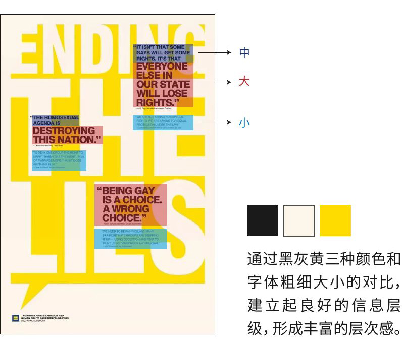 为了使对比更丰富,可以加入字型和色彩对比,加强层级关系,使重点内容强调突出。