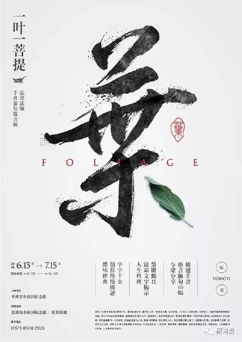 主体“叶”书法字有着手写的动感,本身就具有质感,置入水墨的纹理进一步强调了效果。可以很好的区分文字信息的主次关系,也增加了画面的视觉美感和艺术表现力。