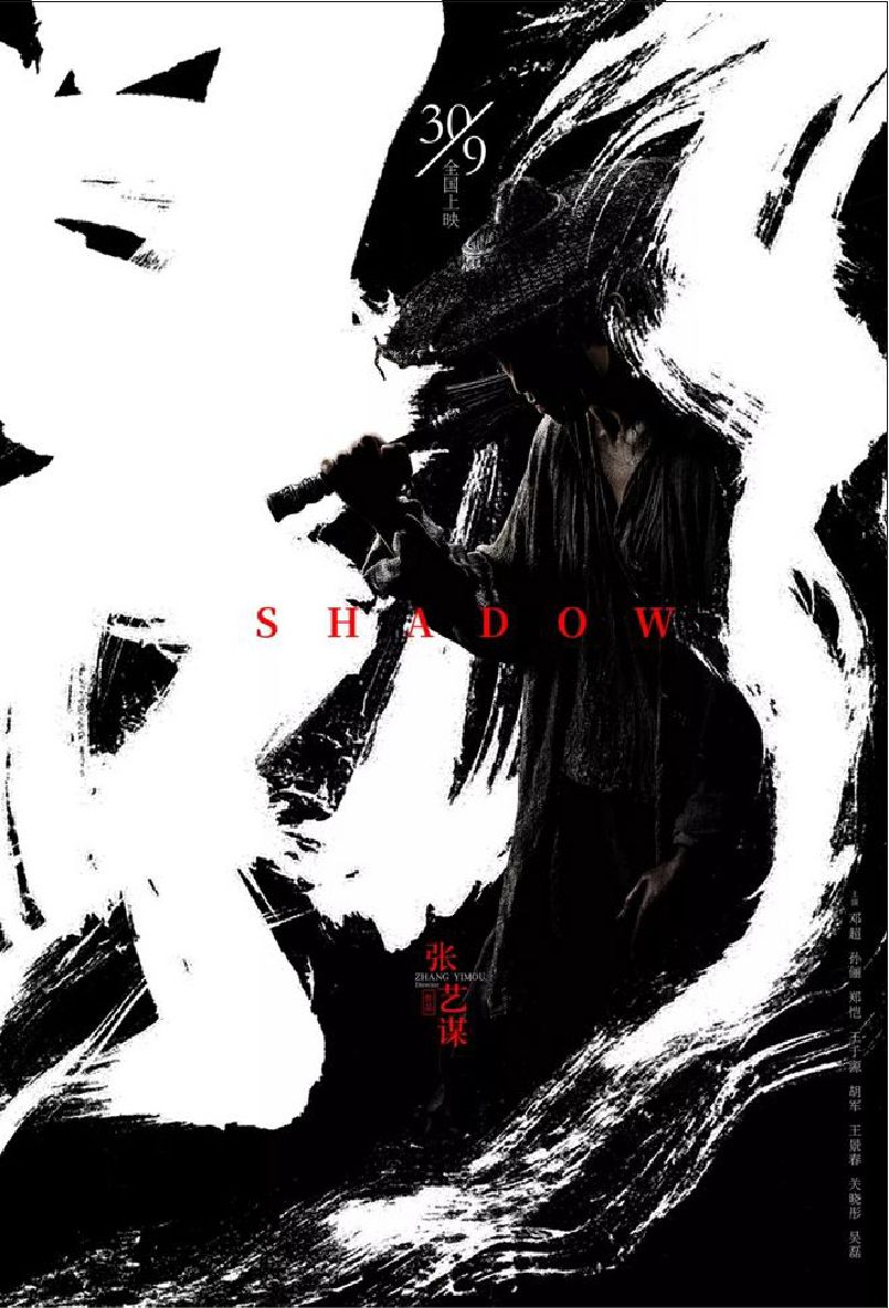 电影海报《影》恣意狂放的反白书法字作为背景具有强烈动感,和主角的静形成鲜明的对比,阴阳与刚柔并济,反映出浓浓的古典中式美学。