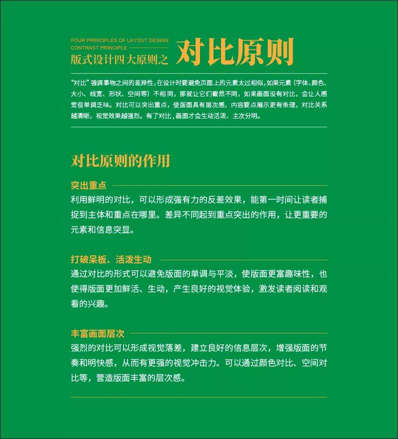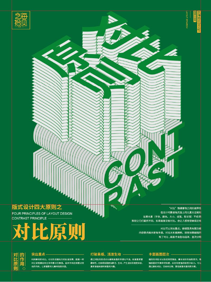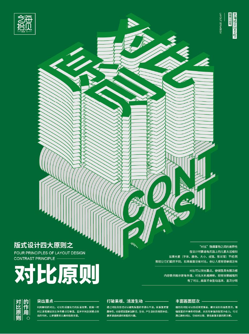 对比是为版面建立有组织的层次结构最有效的方法。强烈的对比可以形成视觉落差,建立良好的信息层次,增强版面的节奏和明快感。