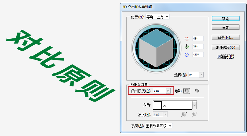 6.分别给四个字执行“效果-3D-凸出和斜角”,把“位置”改为“等角-上方”,厚度改为0: