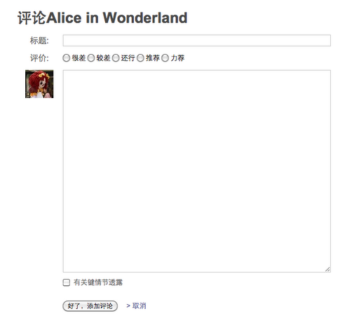 对于一些鼓励用户去进行的操作,应该淡化“取消”的操作。比如豆瓣上这个发表电影评论的页面,使用灰色和小字,在格式上也与其他的按钮不一样,整个页面只突出一个“好了,添加评论”按钮。