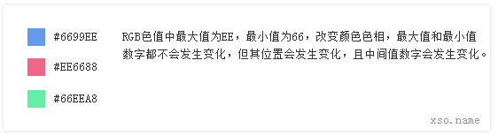 iii.变换RGB的中间值可以影响色相,例如#FF0055和#FF0088;