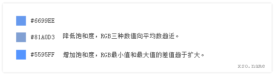 通过降低蓝色通道色阶来降低颜色整体的饱和度(例如将#0000FF调整为#000099),为避免过暗,和黑色混淆,我们还可以增加其他原色通道的色阶,调整其明度(例如将#000099调整为#005599)。