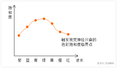 波长较长的颜色和波长较短的颜色,相对较低的饱和度都就能够刺激视觉神经兴奋,而波长处于中间的绿色青色,则需要相对较高的饱和度才能刺激视觉神经兴奋。
