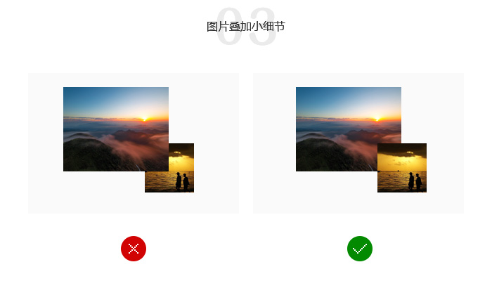 两张或者多张图片叠加的时候,有大图和小图结合,小图更多会展示细节部分,很多时候会不经意间将小图遮住,这样就不利于小图的展示,反而更像修饰,既然是修饰可以尝试用图形等元素,如果你是想展示出来细节完全只以把它放在大图上面展示。