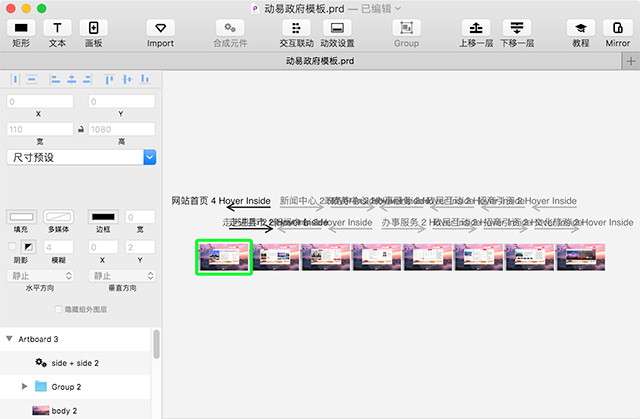 为每一个要切换的画面,建一个画板,同时对导航做当位置状态,画板与画板之间用点击来触发联接,可以看到这种切换的效果了