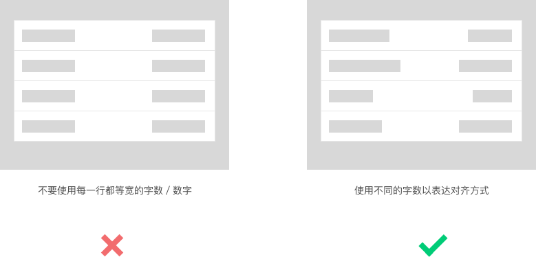 列表或表格上下行不要使用等宽的文本内容,而要展现不同长度的内容以表达对齐方式。